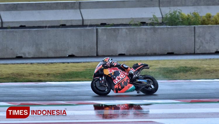 Pembalap tim Red Bull KTM, Miguel Oliveira melahap trek basah Sirkuit Mandalika, saat lomba seri kedua MotoGP di Mandalika, Lombok, NTB, Minggu (20/3/2022). (FOTO: Tria Adha/TIMES Indonesia)