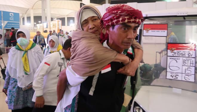 TIMES Wamena/Petugas PPIH menggendong jemaah risti di bandara KAIA Jeddah, jelang pulang ke tanah air. (FOTO : istimewa).